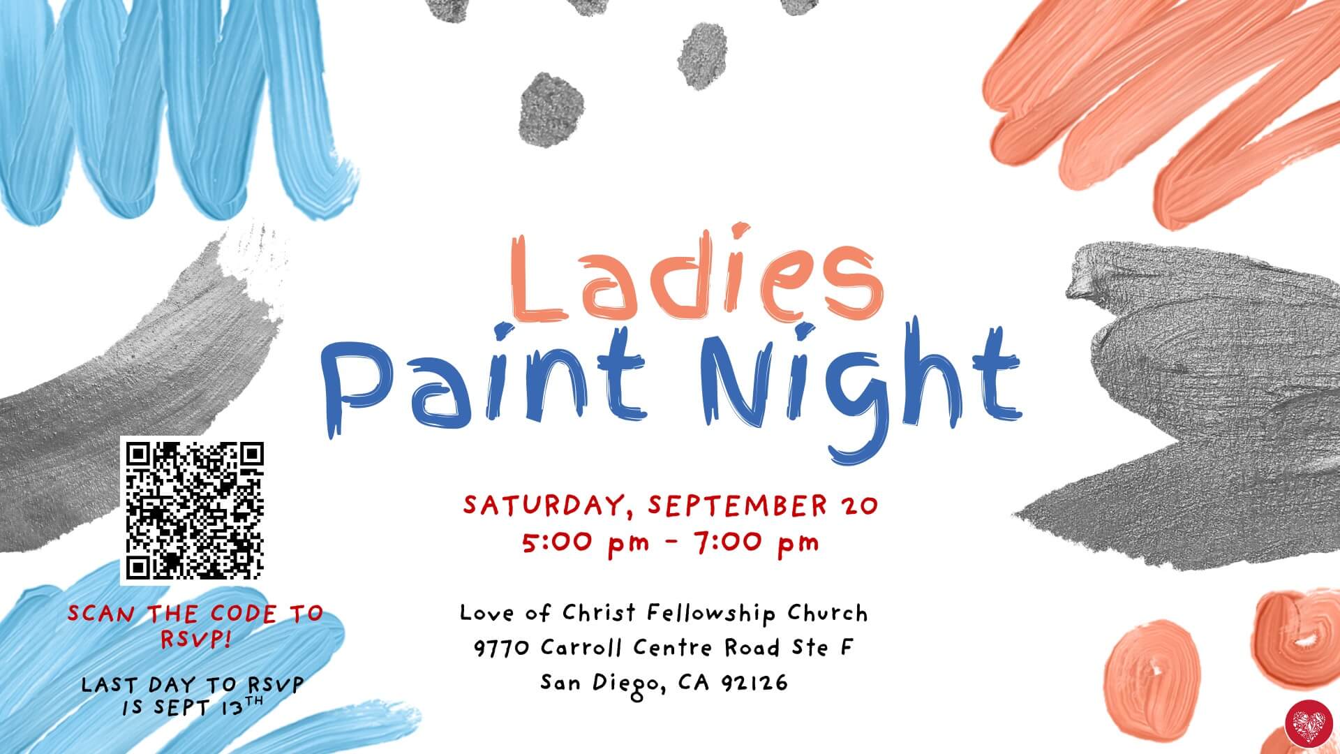 Love of Christ Fellowship Church 9770 Carroll Centre Road Ste F, San Diego, California, United StatesUnwind, create, and connect! Join our Women’s Ministry for a fun and relaxing evening of painting. No experience needed—just bring your creativity and enjoy fellowship with other amazing women. Supplies and light refreshments will be provided. Email the Women's Ministry for questions at women@locfsd.org.
